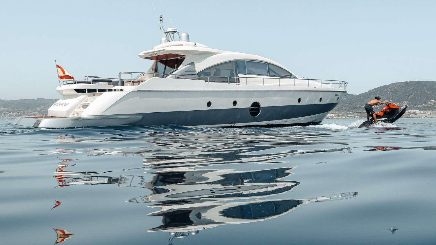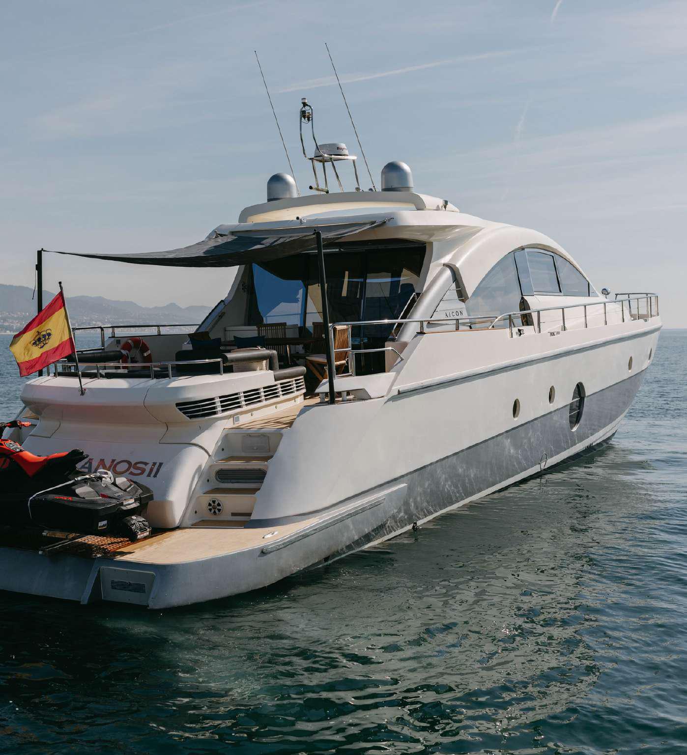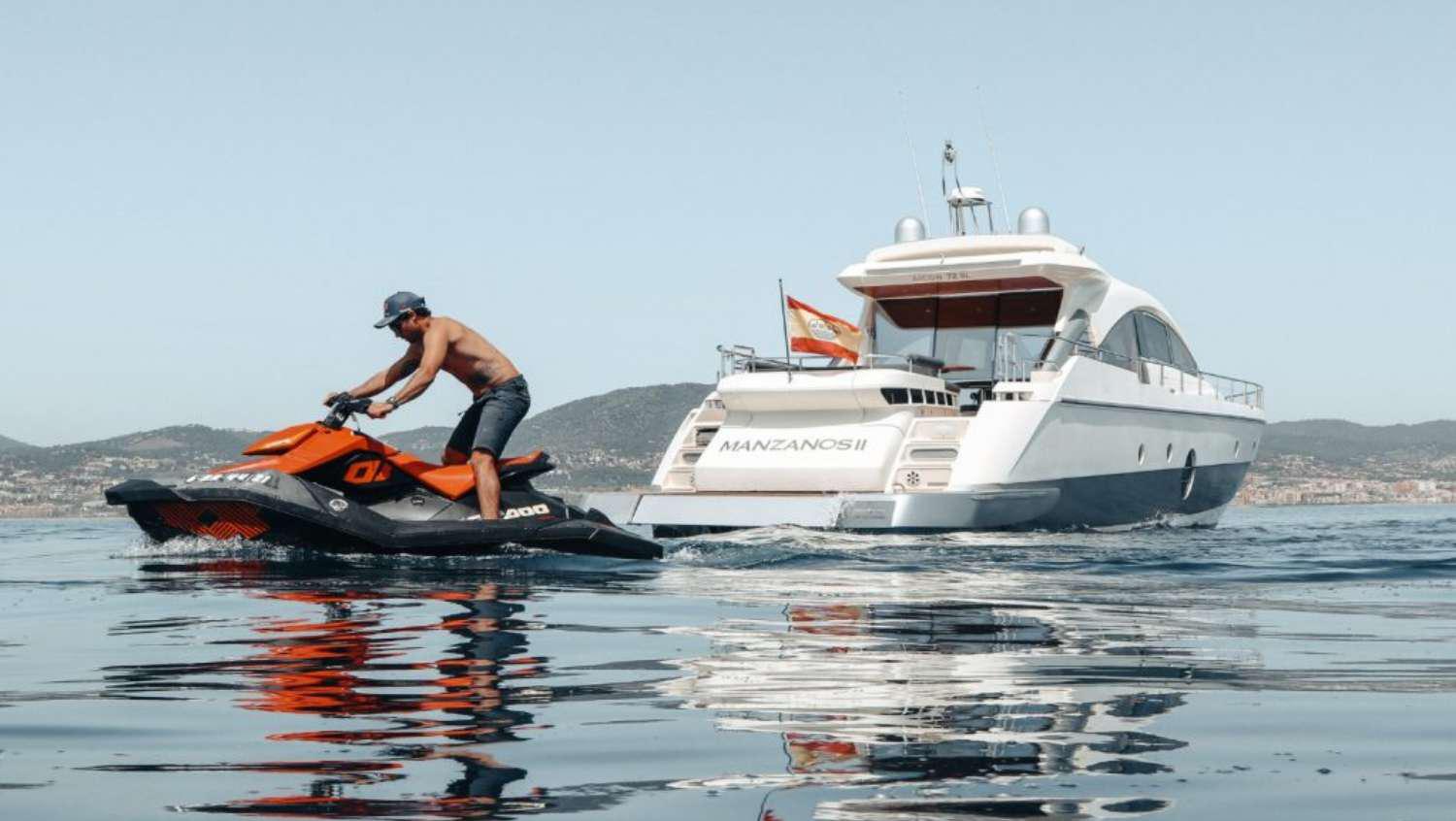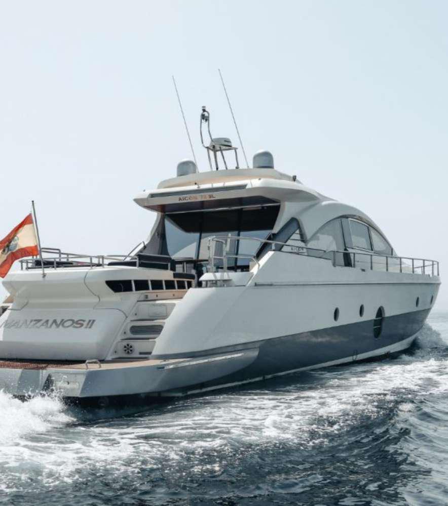 Con 23 metros de eslora, este modelo destaca por su diseño italiano, su navegación ágil y su distribución inteligente, que combina amplitud, confort y luminosidad en cada espacio. El “Manzanos II” está concebido para ofrecer una experiencia exclusiva tanto en navegación como en fondeo, con zonas exteriores ideales para tomar el sol, relajarse o disfrutar de una comida con vistas al mar.